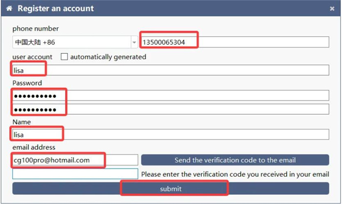 Complete all required fields, including username, password, email, phone number, etc.